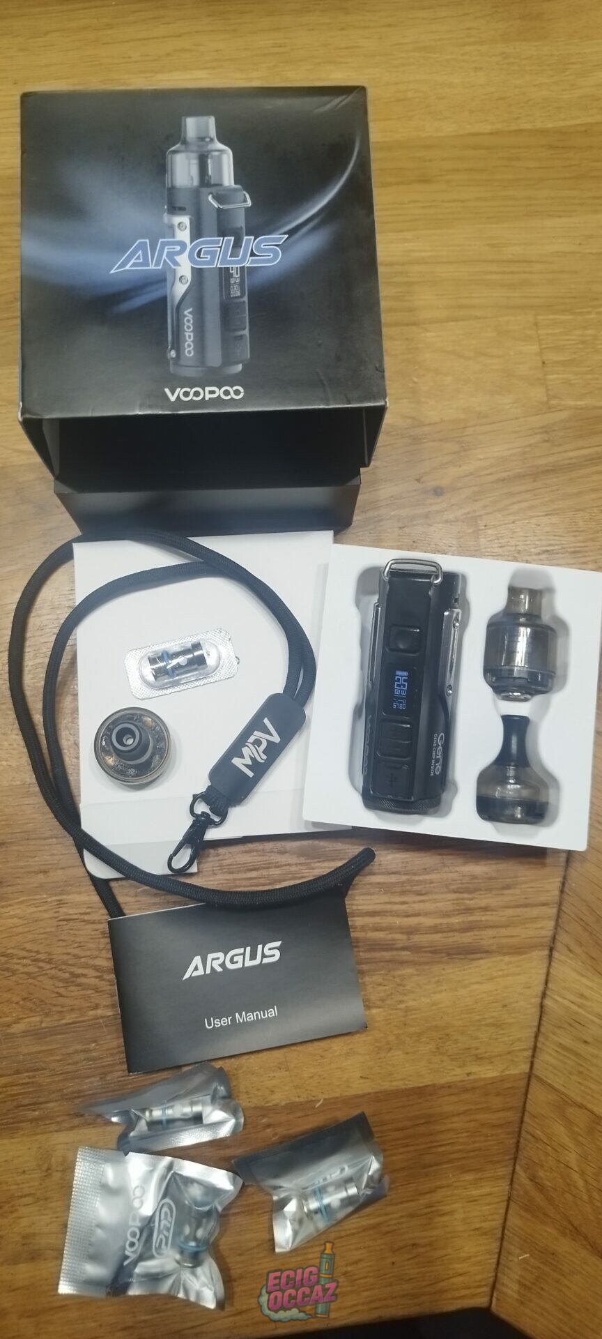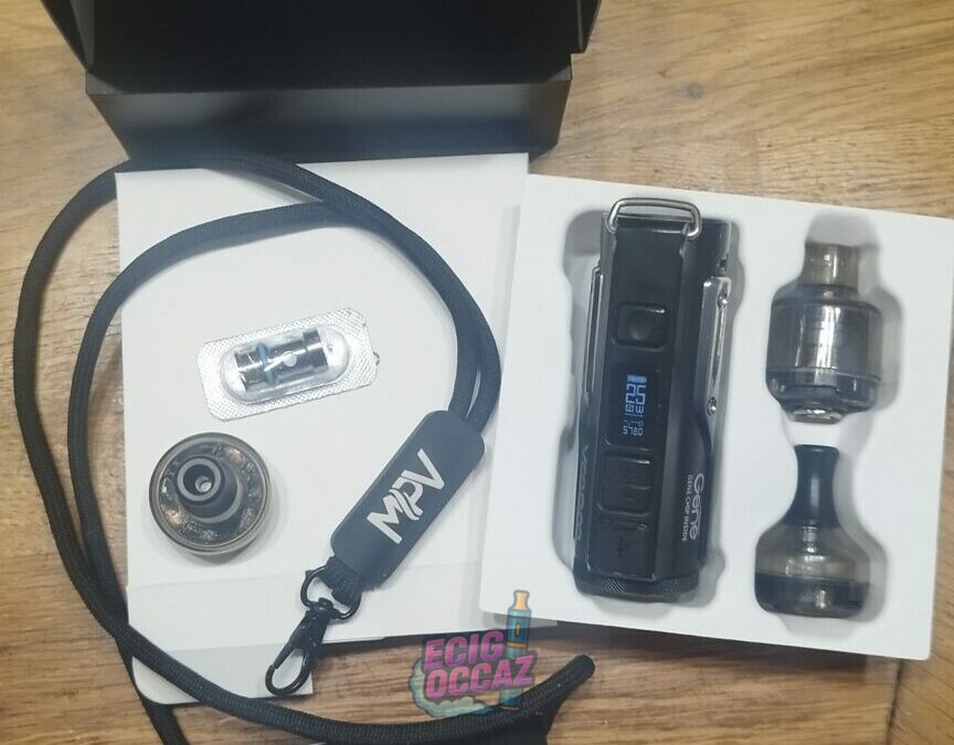 Cigarette électronique peu encombrante dans sa boîte d’origine avec 3 embouts et 4 résistances ainsi que le mode d’emploi et une dragonne.