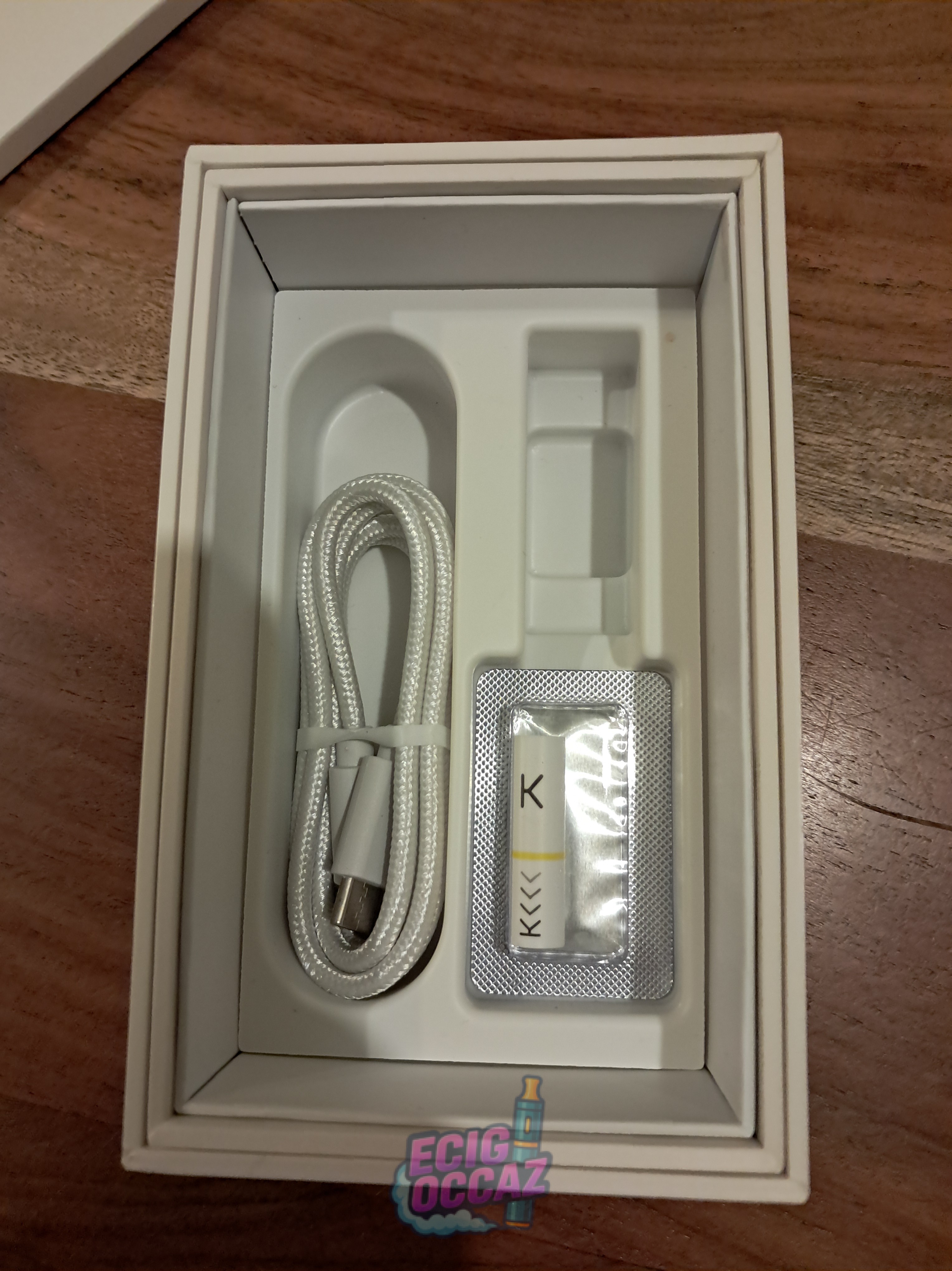 Vendue dans sa boîte d’origine, avec chargeur USB, 1 pod et 1 tip.