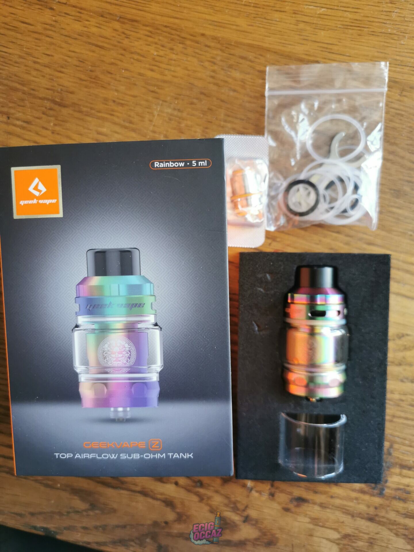 – 1 clearomiseur Geek Vape modèle Zeus couleur arc en ciel avec 1 bol 8ml en verre de rechange et ses joints (quasi neuf)
