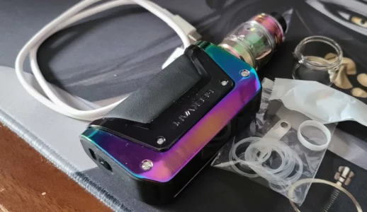 Pratiquement neuf, il n’as aucune rayure ni marque d’utilisation. Comme je l’ai écris plus tôt il n’as été utilisé qu’une seule fois avant de devoir le vendre. Les raisons ? J’ai plus besoin de manger que de vapoter et en tant qu’ancienne fumeuse je n’ai pas du tout accroché.