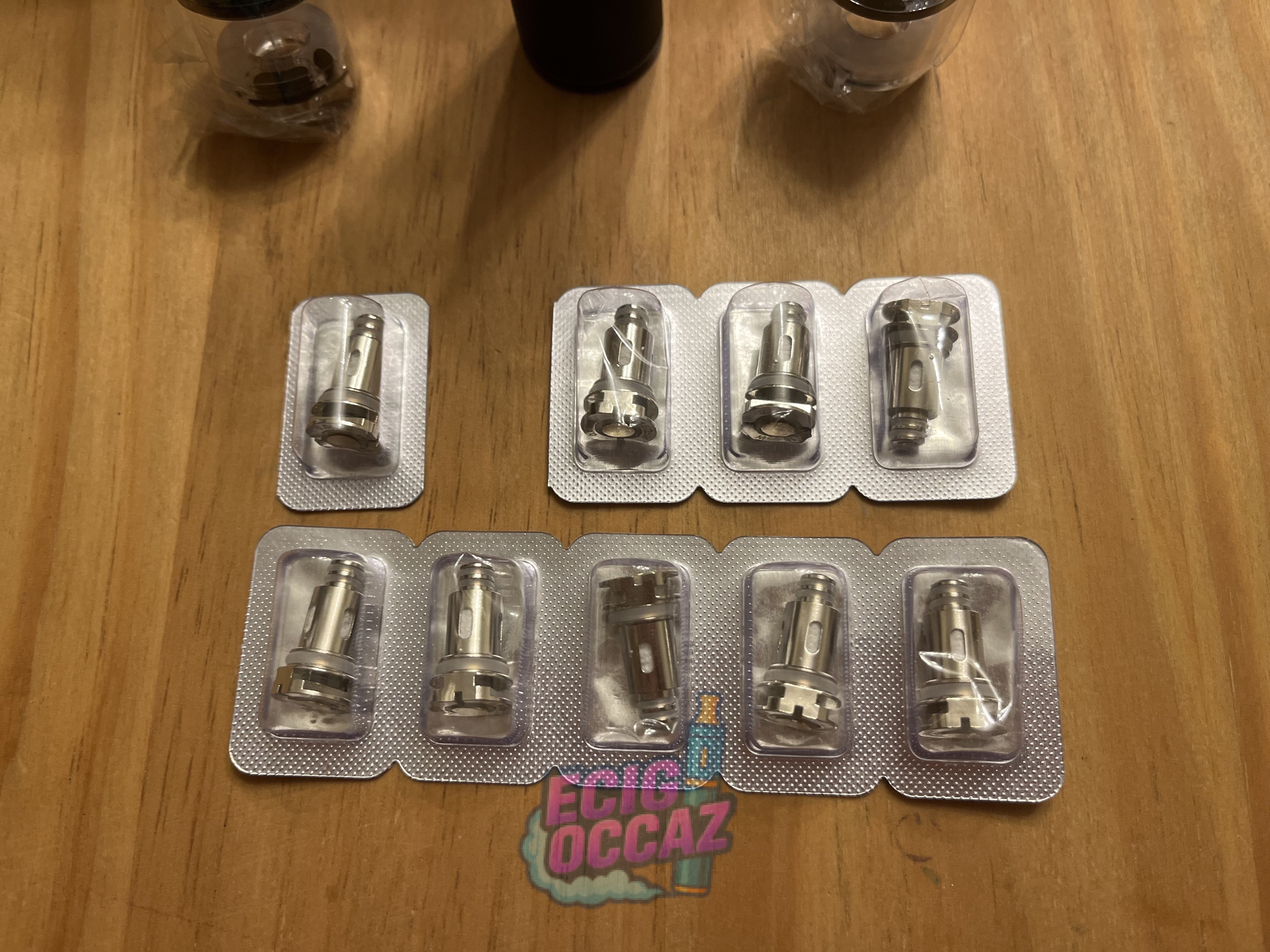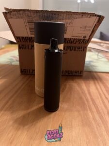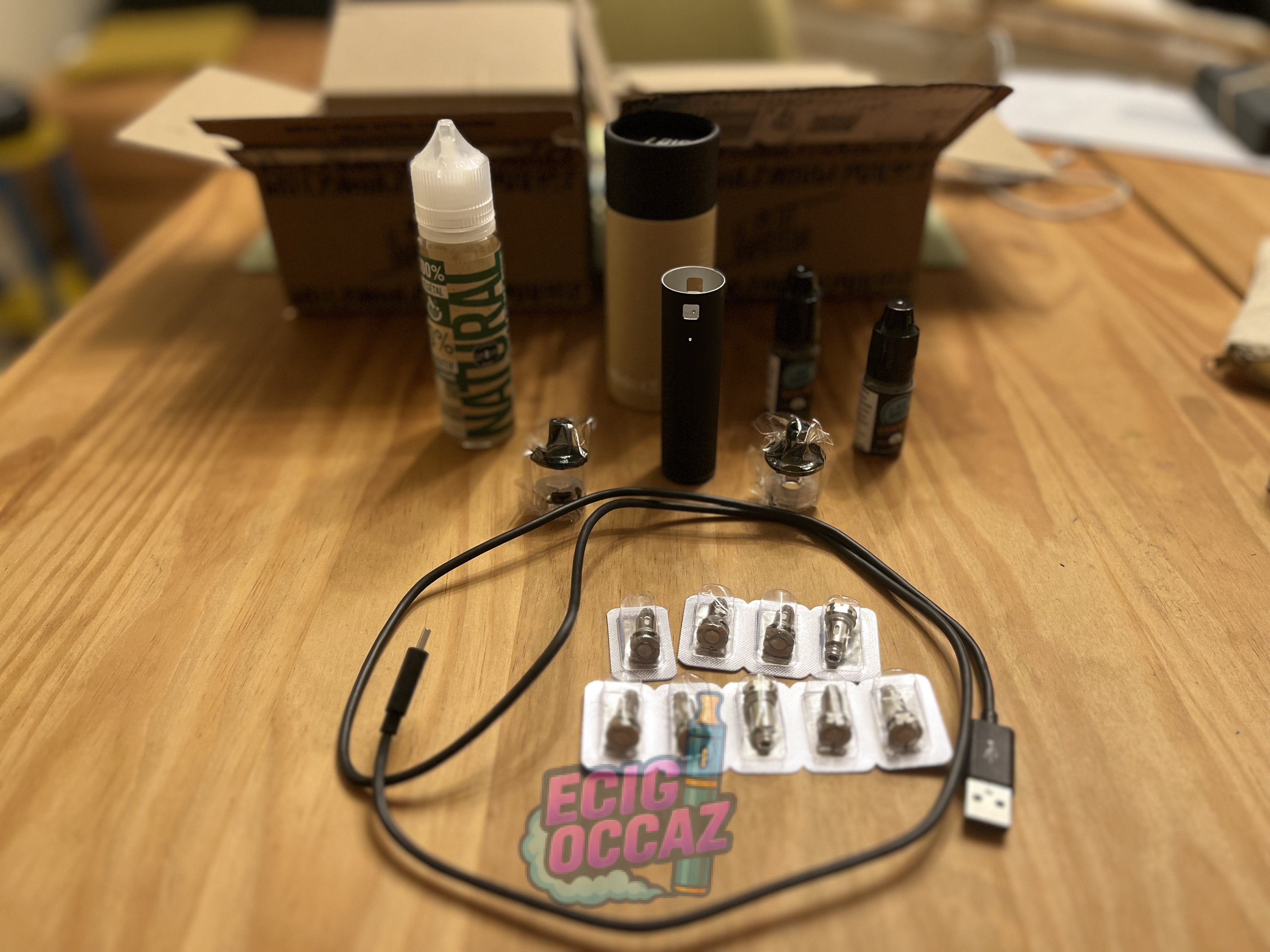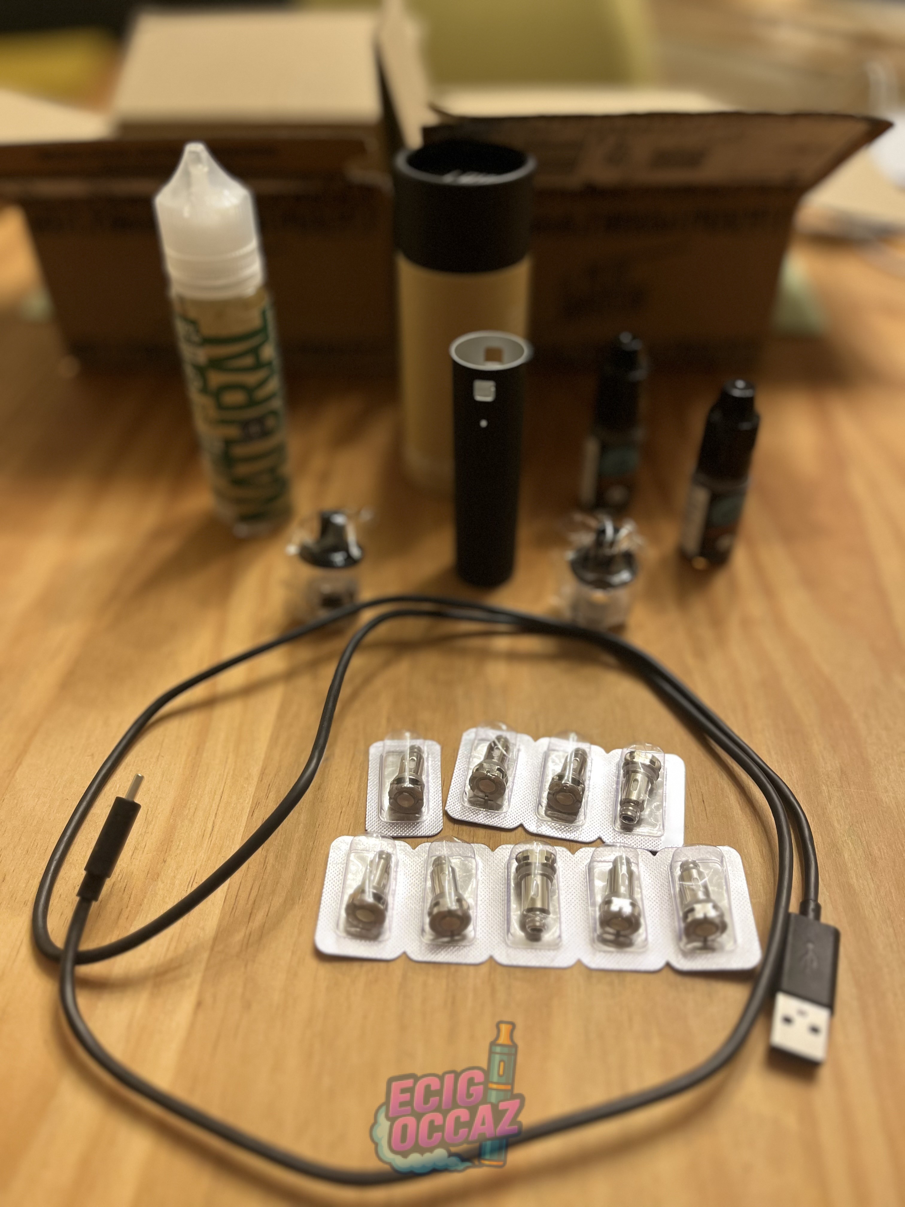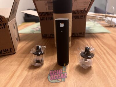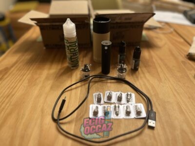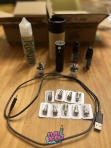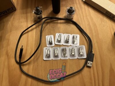 Vendue avec câble de chargeur, deux becs neufs, 9 résistances neuves, un flacon de 10ml neuf à la menthe douce, mode d’emploi et goodies.