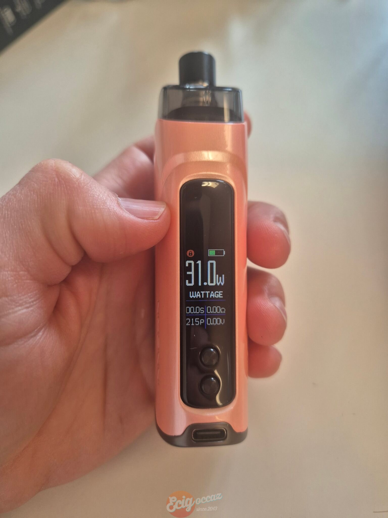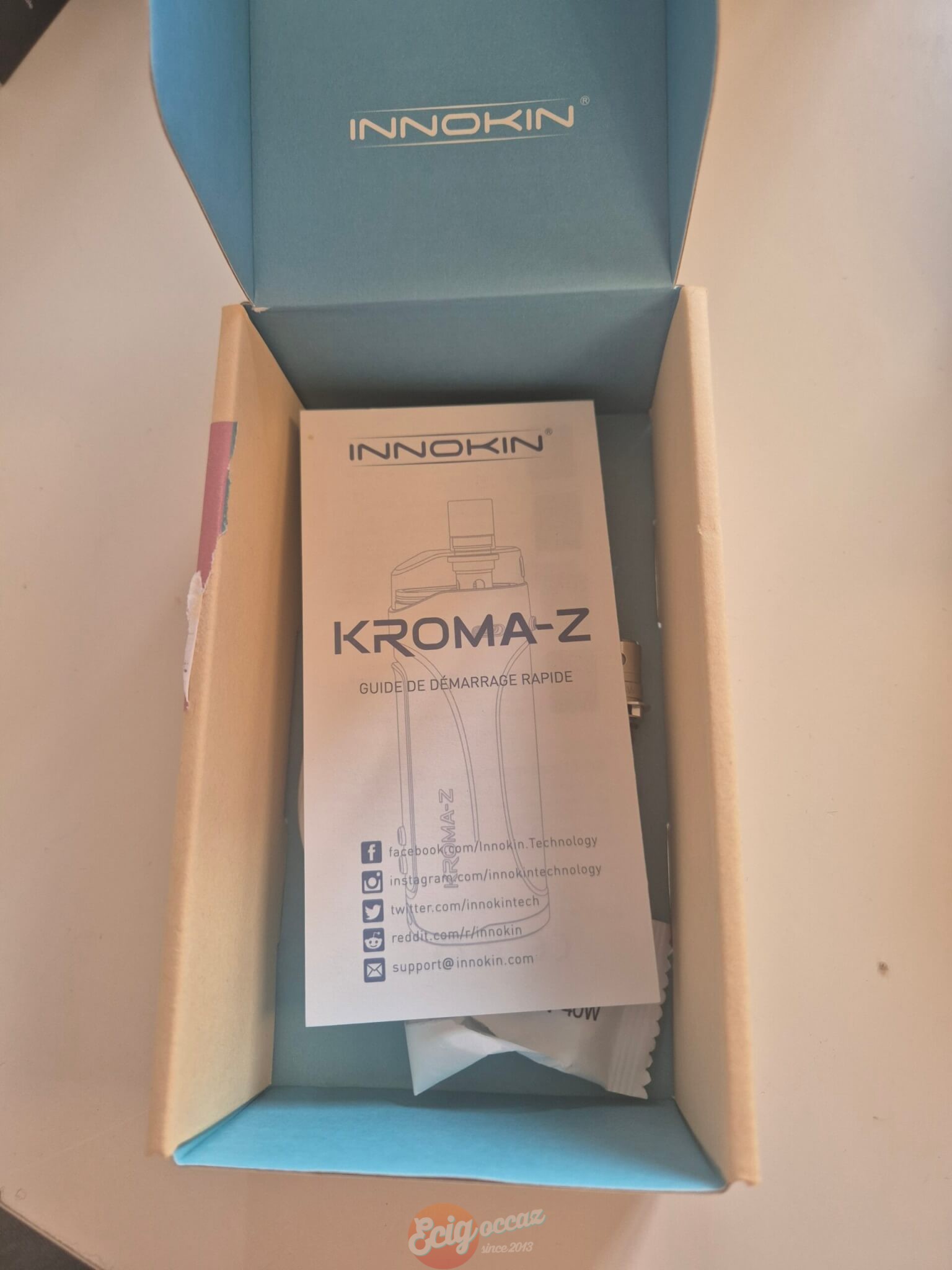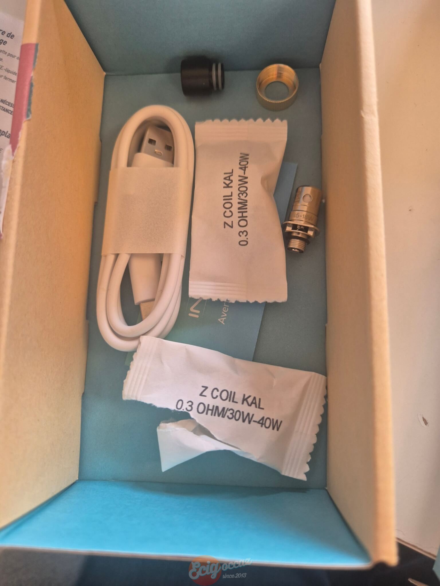Vendu dans sa boîte avec un 2nd drip tip, une résistance permettant de vapoter entre 15 et 18W, 2 autres entre 30 et 40W et le câble de chargement.