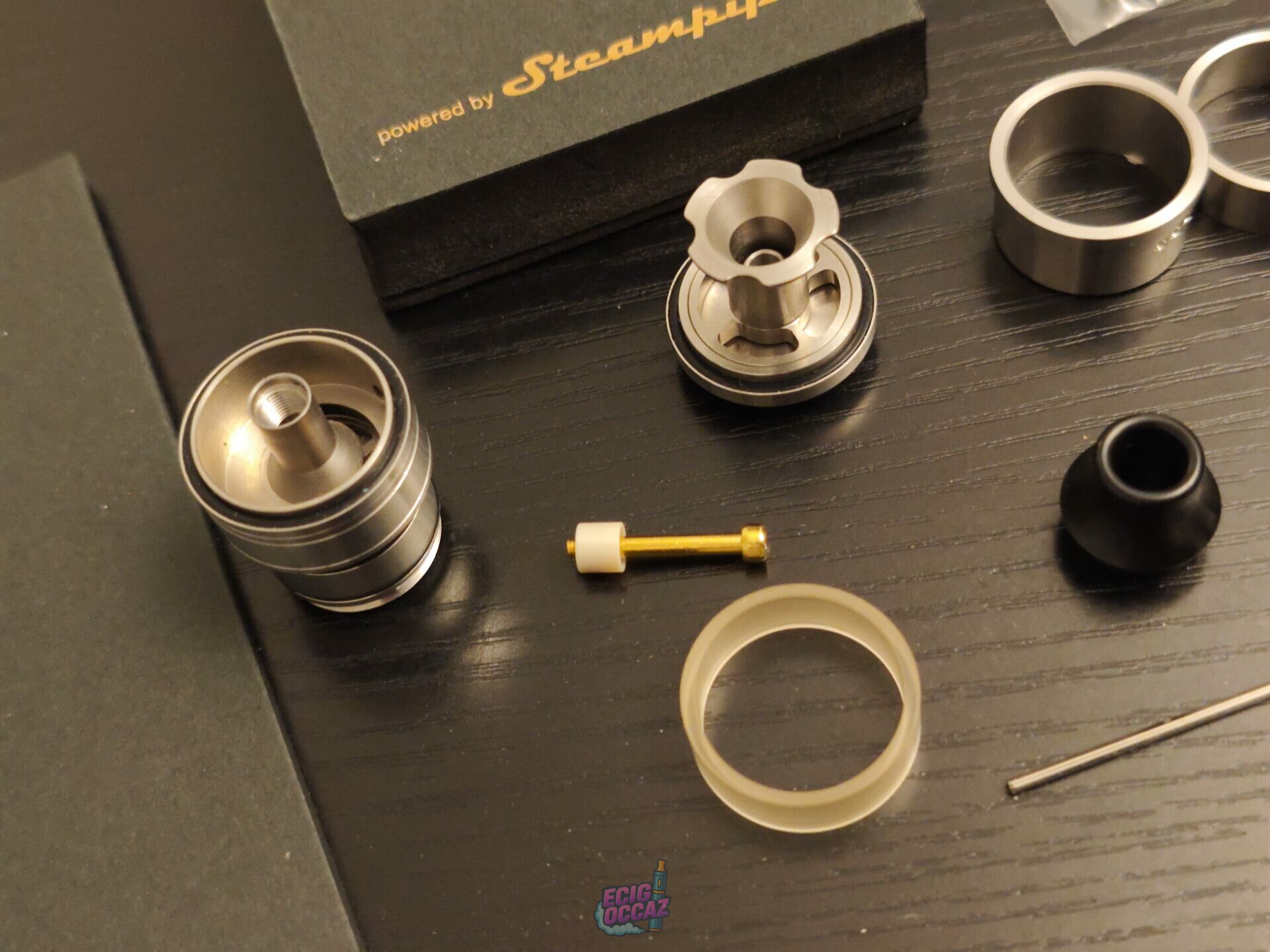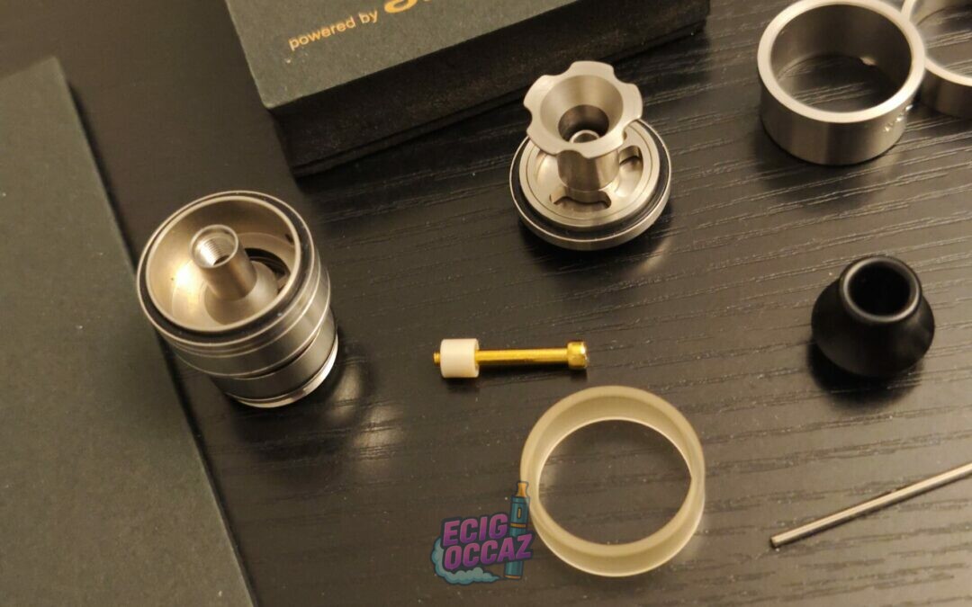 Vendu avec : boîte, pièces de rechange (joints, vis, etc.) et drip tip d’origine.