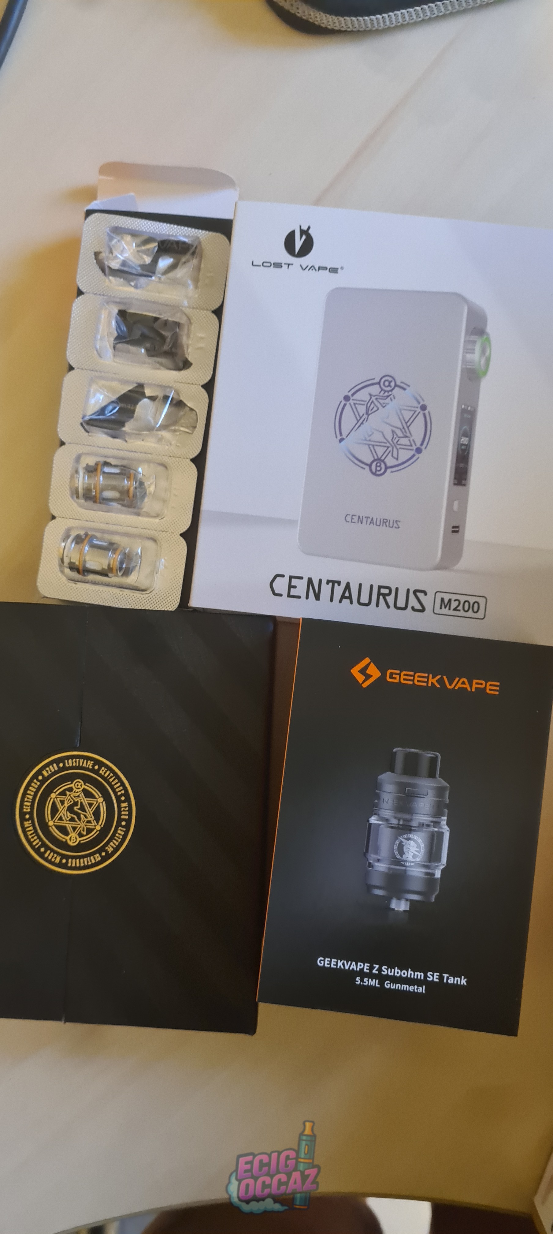 Centaurus M200 box abîmé, avec trois résistances (une dans la boîte de la tête) deux liquide scellé. Boite complète avec le chargeurs et la notice.