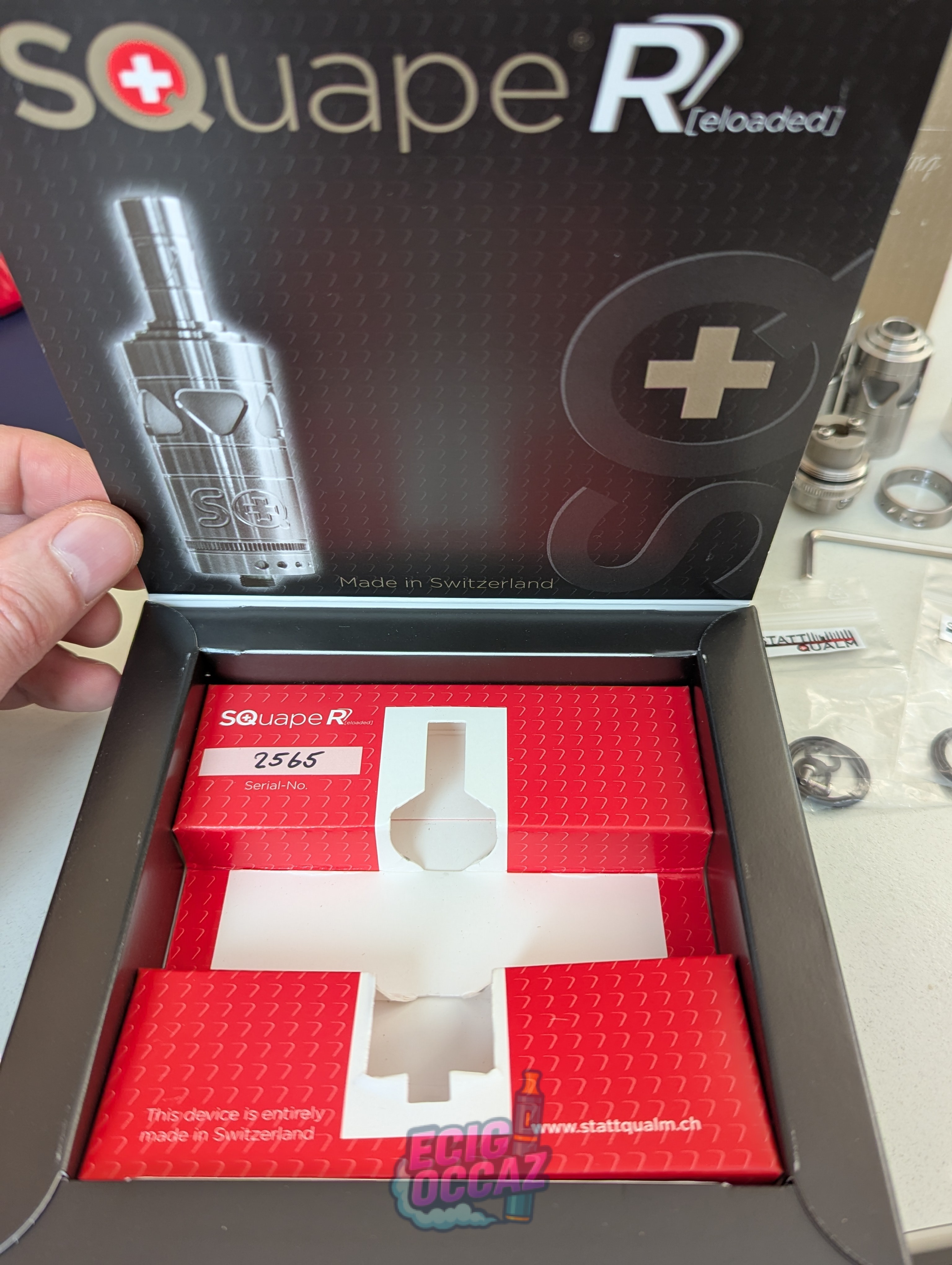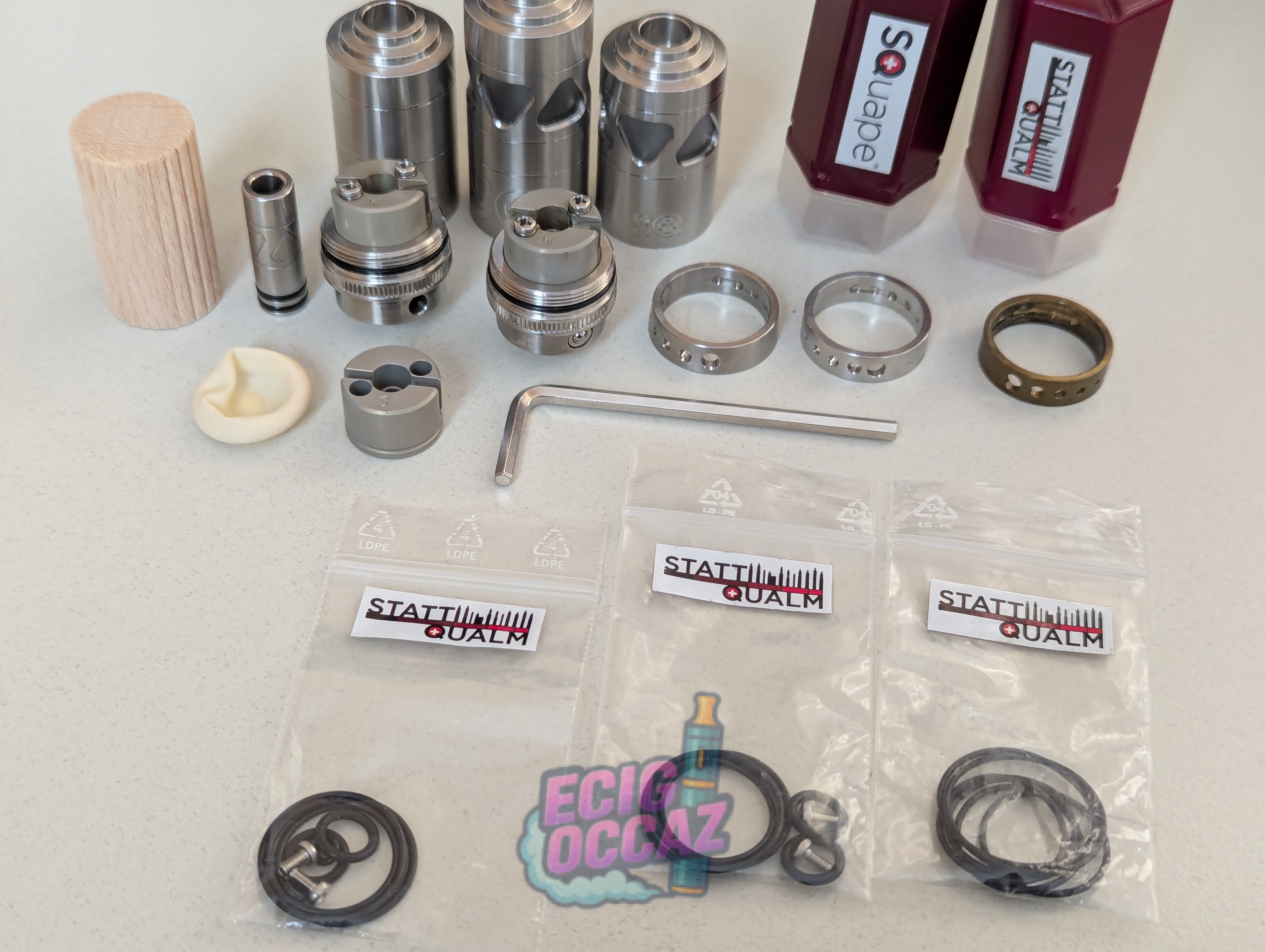Lot comprenant atomiseur SQuape [R] de StattQualm, achetés neufs, en excellent état, très peu utilisés, avec tous ses accessoires d’origine. Matériau et finition premium, idéal pour vapoteurs exigeants ou collectionneurs.