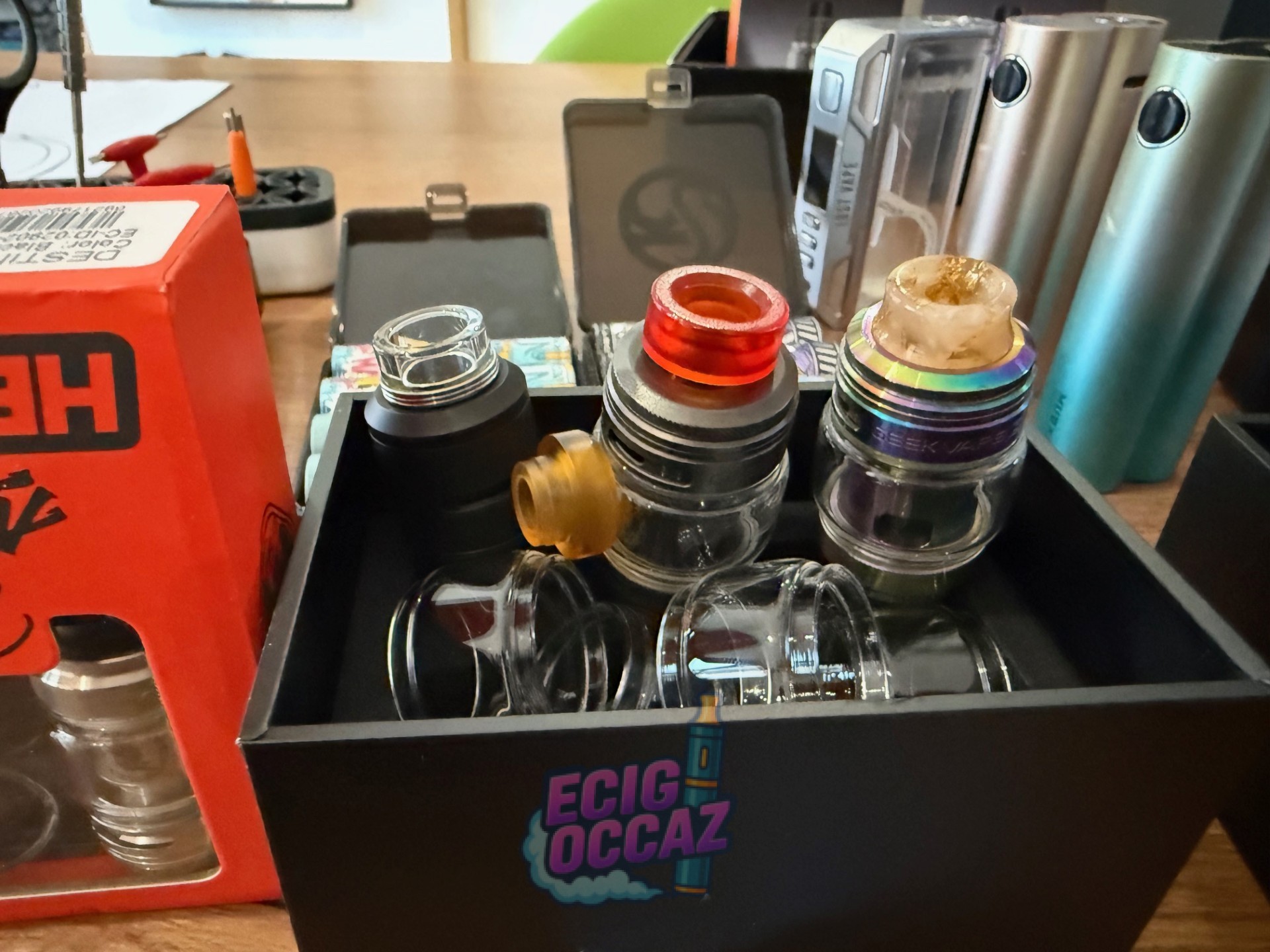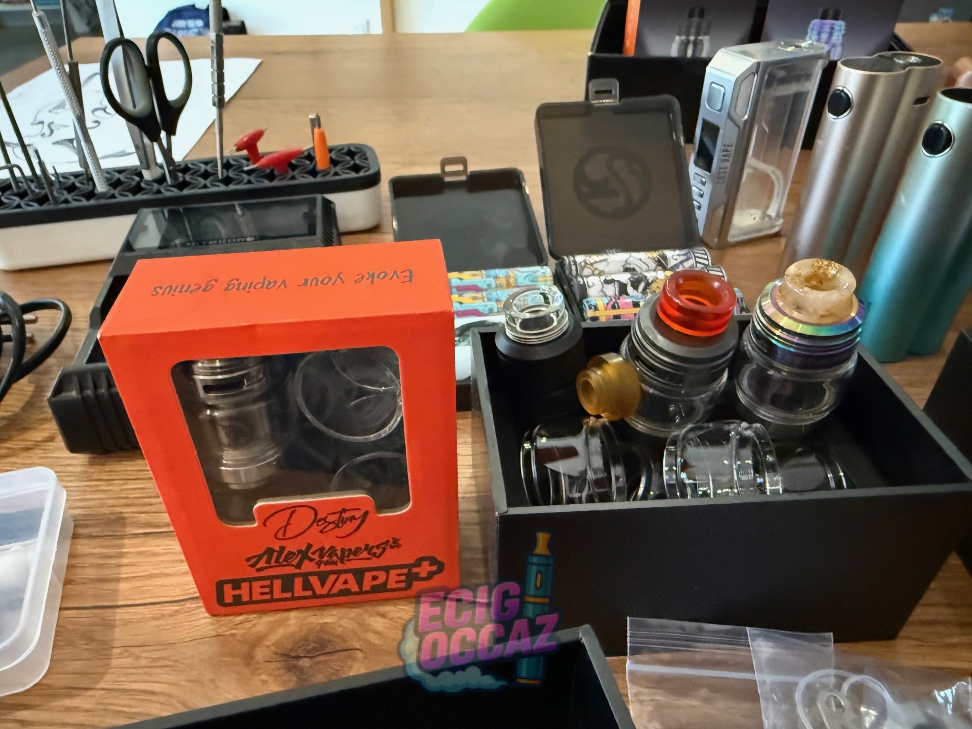 Le lot comprend un mod tube haut de gamme, plusieurs box et mods (formats tube et box), des atomiseurs et clearomiseurs avec de nombreux tanks en verre de rechange, des drip tips et pièces de rechange, des accus 18650, un chargeur d’accus, du coton pour reconstructible, des coils, fils, joints et visserie, un kit complet d’outils pour le montage, des étuis de transport ainsi que des boîtes d’origine pour une partie du matériel.