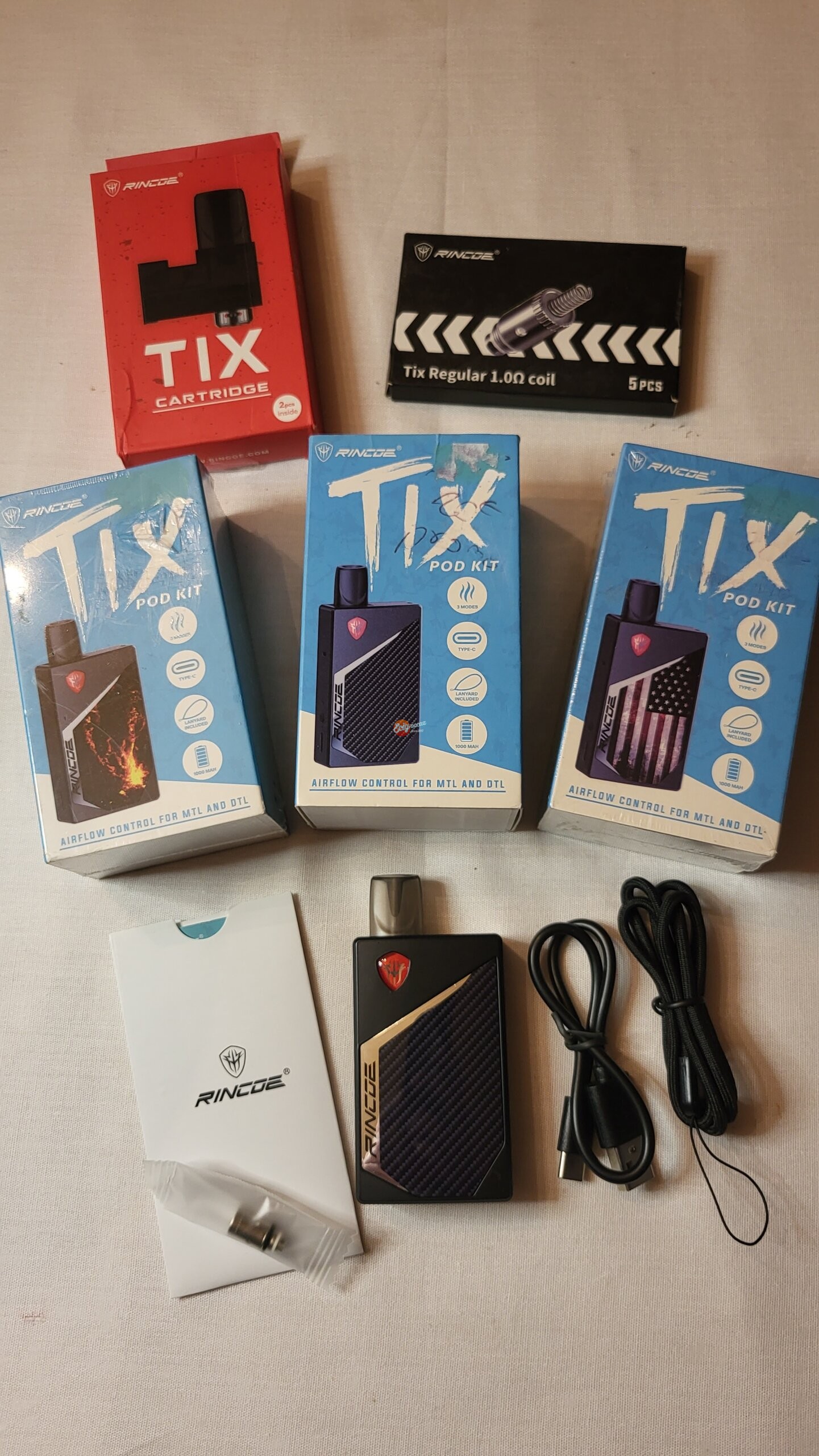 Lot de 3 pod kit Tix de chez Rincoe (drapeau américain, carbone et feu) + 2 pod tix avec chacun 1 résistance + 1 boîte de 4 résistances