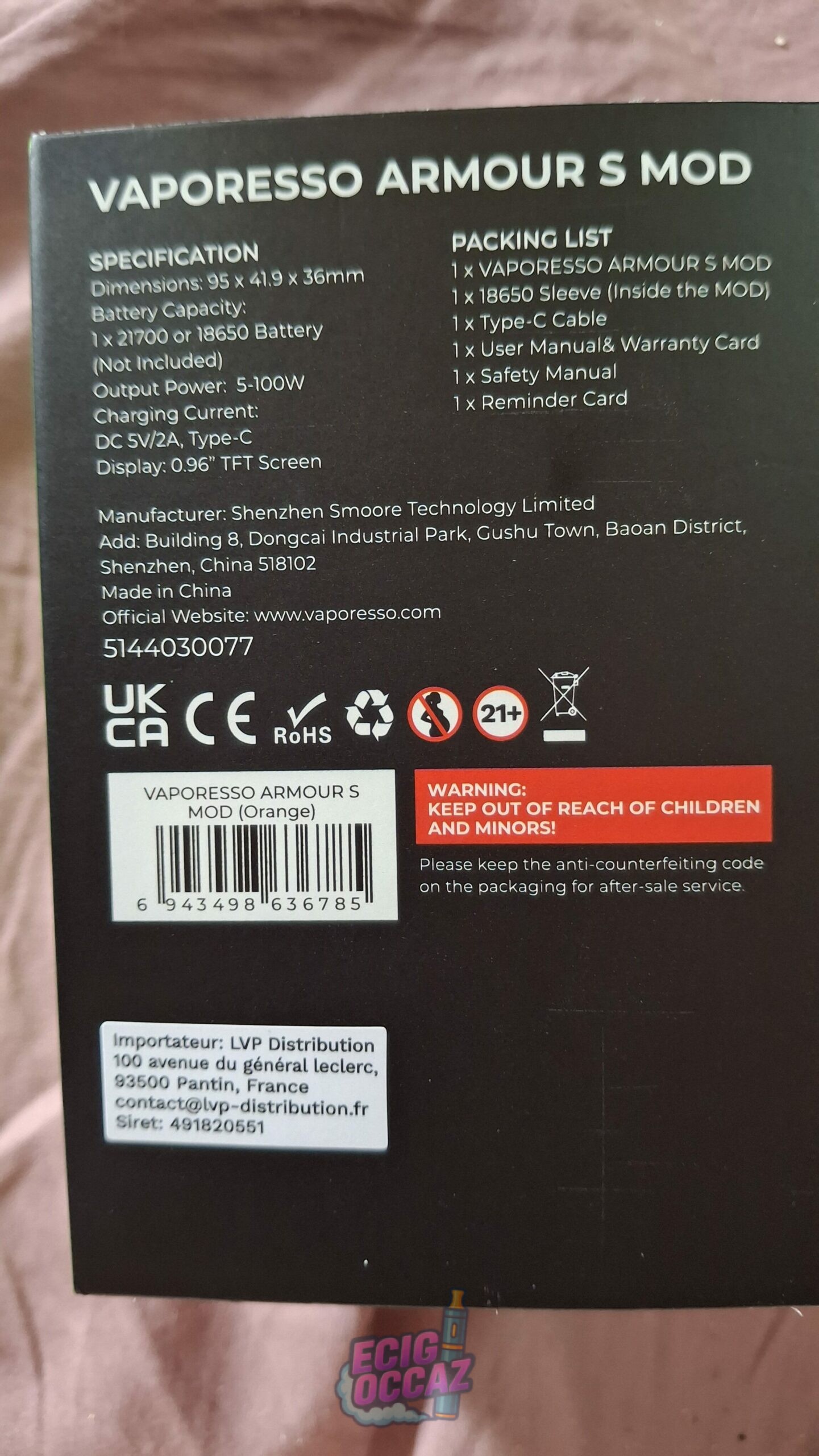 Box pour cigarette électronique (vendu sans clearomiseur) de marque VAPORESSO Armour S